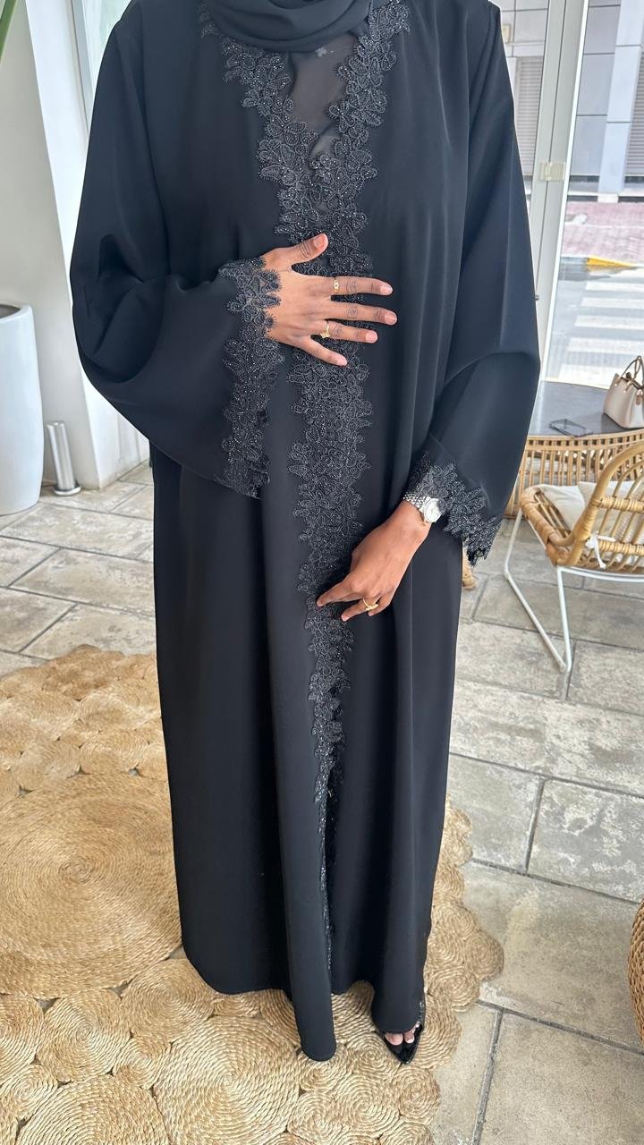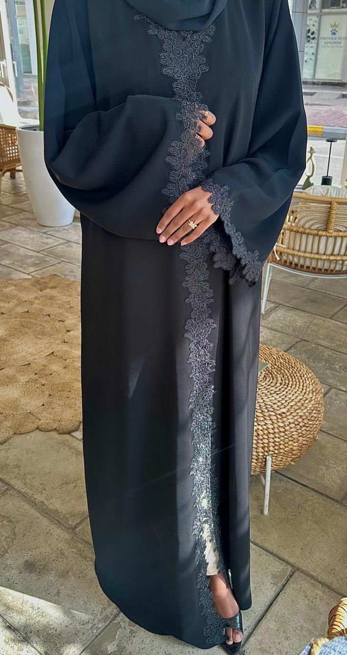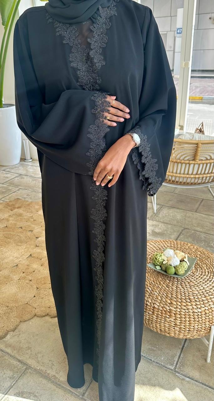 عباية سوداء مميزة بتطريز الفراشات بأحجار لامعه على طول العبايه، تضيف لمسة أنثوية جذّابة وفخمة.